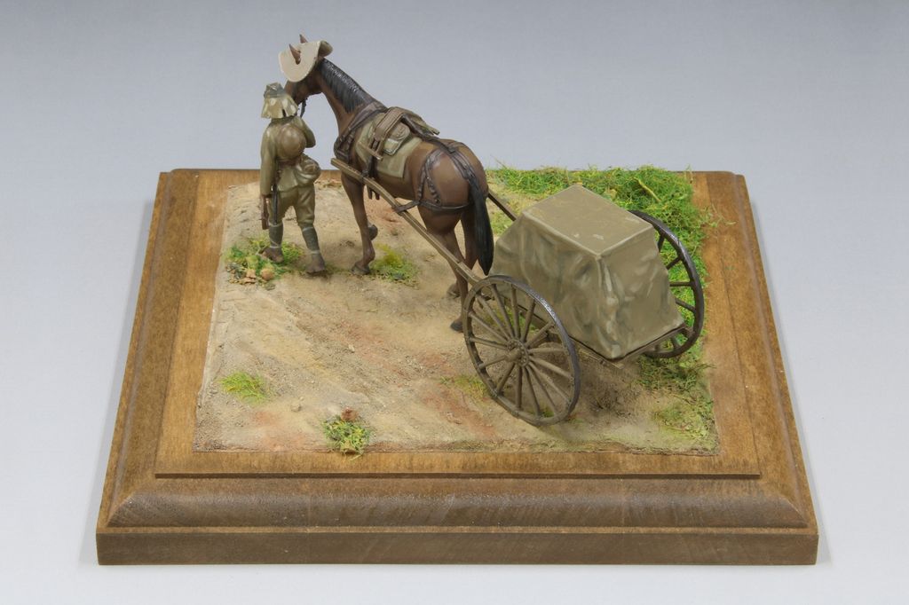 This model kit includes a horse and its handler, a cart and also suitable cargo in the form of military provisions, as well as a number of options such as blinkers for the horse.